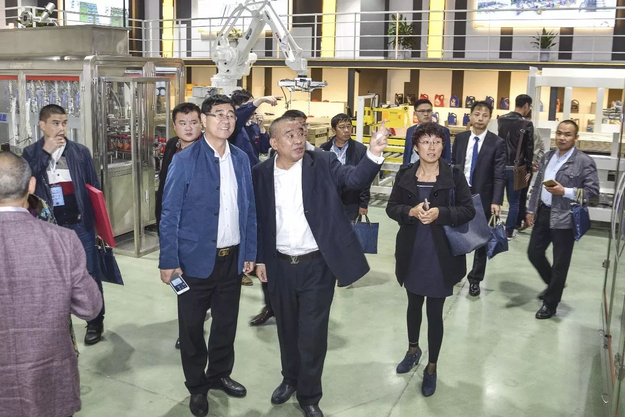 (參會嘉賓參觀湯姆集團灌裝線生產自動化立體倉庫存儲現場)